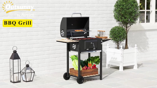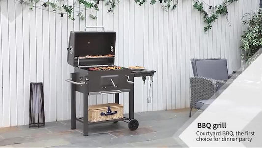 Charcoal Grill BBQ Trolley with Adjustable Charcoal Grate, Garden Metal