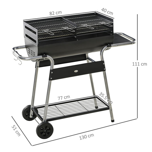 Charcoal Barbecue Grill Trolley with Double Grill, Side Table and Storage Shelf